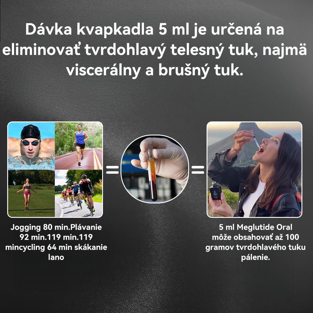 Štúdie ukázali, že 5 ml perorálneho roztoku Meglutide dokáže spáliť až asi 100 gramov tvrdohlavého tuku. A spáliť 50 gramov tuku cvičením trvá dlho (80 minút joggingu, 92 minút plávania, 119 minút bicyklovania, 64 minút skákania cez švihadlo). Dávka jedného kvapkadla je 5 ml a je špeciálne navrhnutá na spaľovanie a odstraňovanie tvrdohlavého tuku z tela, pričom je obzvlášť účinná pri redukcii viscerálneho a brušného tuku.